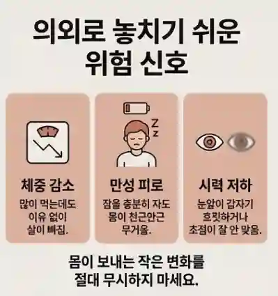 📊 전조 현상: 이유 없는 체중 감소와 극심한 피로감을 경계하세요.